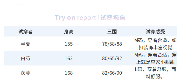ไซส์ M : ไหล่ 29 ซม. / รอบอก 87.5 ซม. / รอบเอว 75 ซม. / ยาว 86 ซม.